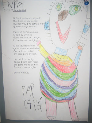 Continuamos a falar do pai e de quanto dele gostamos com um poema de Rosa Mateus, que ilustramos desenhado o pai e escrevendo (tentando) as palavras pai e papá.
