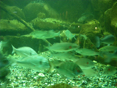 Já dentro da sala dos aquários e no escurinho, escutamos com atenção as explicações que o biologo Dr. Patrício nos deu sobre os diveros peixes e aquários. Eles retratam alguns habitats do rio Minho, desde a sua nascente até à foz.