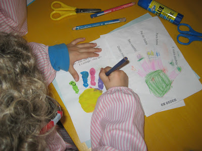 Começamos a desenhar e contornar as mãos...e a repetir as rimas...